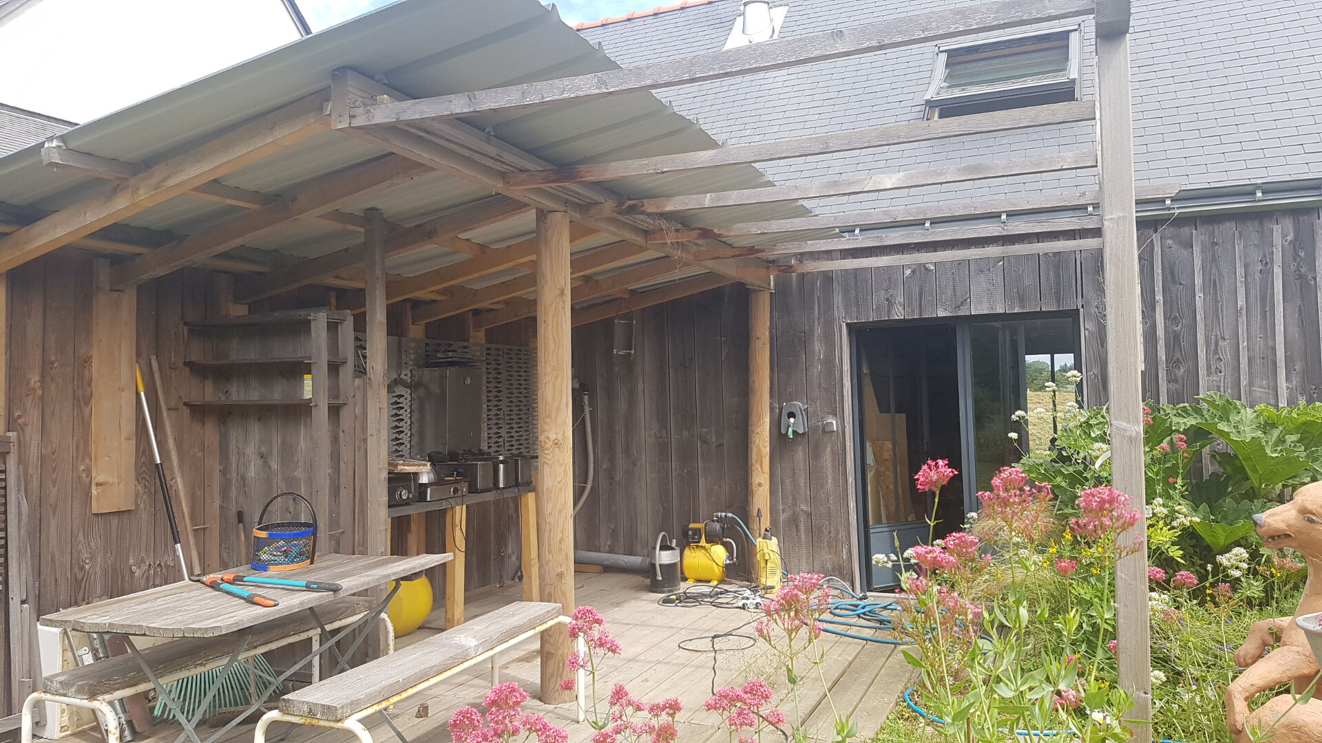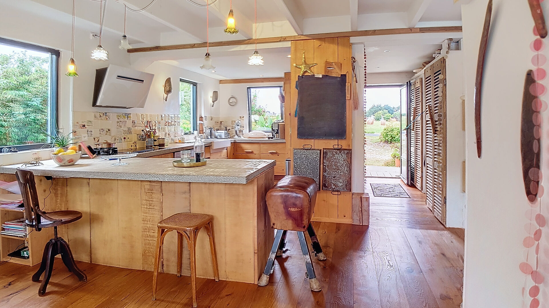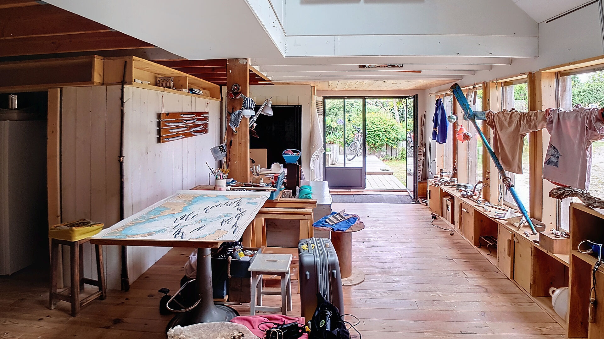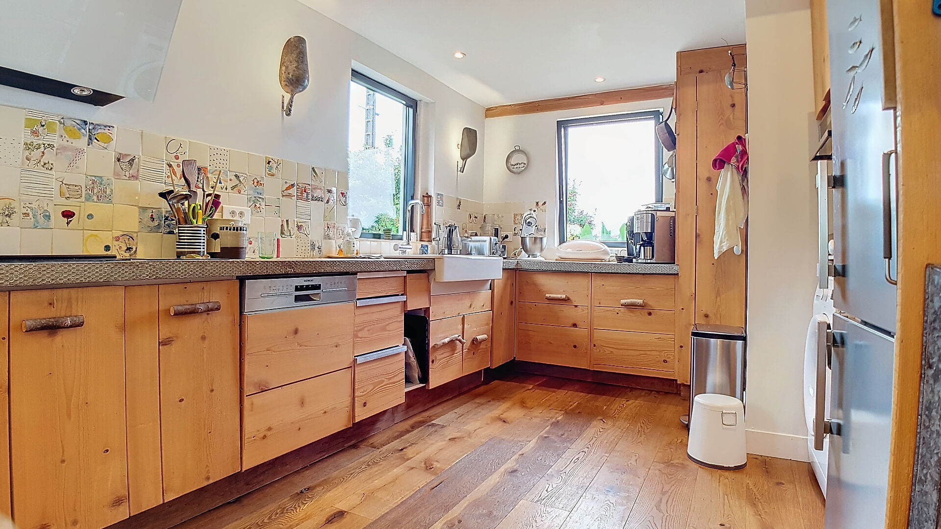 D'une superficie de plus de 200 m², la maison se compose, au rez-de-chaussée, d'une cuisine ouverte moderne, d'une vaste pièce de vie qui s'ouvre sur une terrasse et un jardin, créant un lien harmonieux entre l'intérieur et l'extérieur. Une chambre avec salle d'eau et WC privatifs bénéficie également d'un accès individuel à la terrasse sud. Au nord, deux ateliers de 38m² et 25m² en grande partie vitrés, parfaits pour les artistes ou pour toute activité créative, complètent ce niveau.
